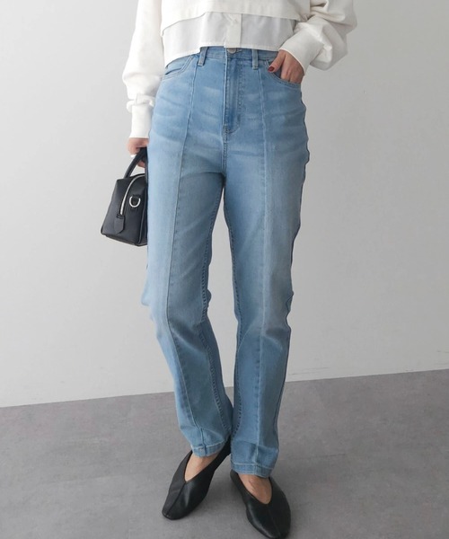 縦のラインを強調するセンター切り替えが施されたデニムパンツ。裾に向かって細くなるテーパードシルエットで、すっきりとした足元を演出します。バックのウエストゴム仕様がラクな着心地を実現◎あらゆるトップスと合わせやすく、着回しの幅が広がるアイテムです。透け感[無し] 裏地[無し] 伸縮性[有り] 光沢感[無し] 生地の厚さ[普通] 付属品[無し] ポケット[有り]前2つ●製品寸法:M:ウエスト[後ゴム仕様]69cm ヒップ88cm 総丈98cm 股下68cm わたり周り27cm 裾幅17cmL:ウエスト[後ゴム仕様]72cm ヒップ95cm 総丈101cm 股下70cm わたり周り28cm 裾幅19cm備考: