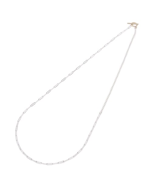 【デザインポイント】異なる2種のチェーンをアシンメトリーに組み合わせたネックレスはY字使いとミドルサイズの一連ネックレスの2WAYで着用いただけます。ブロック調のカットを施したチェーンは角度できらめき、シンプルでも華やかな印象を与えます。【スタイリングポイント】リング部分を前にしY字のように垂らして着用すれば、こなれ感のあるデイリー使いに。リング部分を後ろに回して1連で着用すればシンプルなミドルネックレスになります。シーンやスタイルで選べるデザインです。店舗へのお問い合わせ商品番号:127-08201●製品寸法:00(FREE):全長68cm 幅0.2cm 付属袋H12.5cm 付属袋W11.5cm備考: