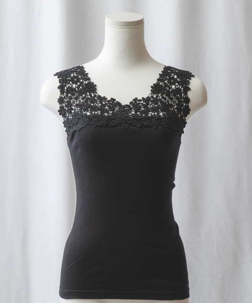 立体的な表情のあるフラワーレースで、装いに華やかさを演出するキャミソール。前後どちらを前にしても着用が可能な2WAY仕様で着こなしの幅も広がります。肌当たりも優しく、着心地の良い綿100%素材を使用。ベースは伸縮性のある細畝のリブ地になっており、動きやすく、シルエットもすっきり見せてくれます。インナーとしてなど、様々なスタイリングにも活躍してくれるアイテムです。・ホワイト身頃は多少の透け感あり・ストレッチあり・カラー展開はオフホワイト、ブラック・サイズ展開は1(M)9号・3(2L)13号