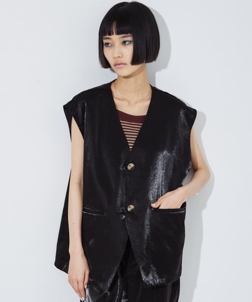 -Design- 程よい光沢と落ち感ハリ感のサテン地と、表面感のあるリネンライクなサマーツイード生地がポイントのシンプルベスト。 着回ししやすいカラーバリエーションも魅力の一つ。 ※カラーにより素材が異なります シルバー、ブラック→光沢素材 アイボリー→ツイード風素材 -Detail- 深いVネックの先にある2つボタンに長めの丈感と全てのバランス感が絶妙な設計で、1枚羽織るだけで一気にオシャレ見え。 バックのスリットが深いベンツ開きがデザイン的に抜け感も出てバックスタイルまで拘り抜いたシルエット。 -Cordinate- 同素材のパンツやスカートと合せてセットアップ着用で旬顔スタイルに。 ロンTやTシャツにプラスするだけで今っぽいコーデにブラッシュアップ。 何か物足りないなと感じるシンプルコーデにプラスしてファッションを楽しんで。 【セットアップ着用可能&同素材アイテム】 ・38483870001【セットアップ着用可】前後2WAYサテンロングスカート ・38483850000【セットアップ着用可】サテンパンツ ・38483890000【セットアップ着用可】2WAYサテンキャミワンピース 【注意事項】 ※商品画像は、光の当たり具合やパソコンなどの閲覧環境により、実際の色味と異なって見える場合がございます。あらかじめご了承ください。 ※画像の商品はサンプルです。 ※商品の色味の目安は、商品単体の画像をご参照ください。 ※商品を使用前に、タグ等に記載されている「取り扱い上の注意書き」「洗濯表示」を必ずご確認ください。 ※商品に不良が無い場合、包装紙および箱の彼損がございましても発送いたします。あらかじめご了承ください。 シルバー モデル:H165 B76 W53 H80 着用サイズ:Fブラック モデル:H165 B76 W53 H80 着用サイズ:Fオフホワイト モデル:H156 着用サイズ:F