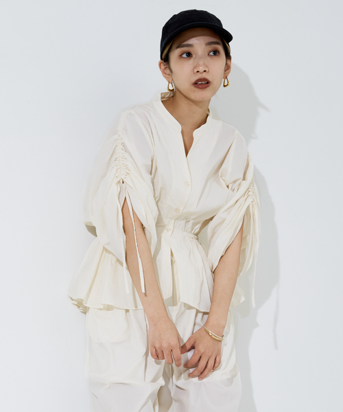 -Design- 軽いワッシャー素材にたっぷりギャザーが入ったデザインブラウスはフェミニンにもモードにも着方によって色々な表情を見せる事ができる万能アイテム。 前後差のあるシルエットでボトムとのバランスも抜群で、袖は紐でギャザー感の調節が可能。 同素材パンツとのセットアップもおすすめです。 ボトムにインをして着用するとジャンプスーツのようにも。 【セットアップ着用可能&同素材アイテム】 ・38483870000【セットアップ着用可】マルチWAYドロストワッシャーチュールスカート ・38483850003【セットアップ着用可】ワッシャーバックドロストパンツ ※ホワイトのみスカートの色が少し異なります。パンツはセットアップ可 【注意事項】 ※商品画像は、光の当たり具合やパソコンなどの閲覧環境により、実際の色味と異なって見える場合がございます。あらかじめご了承ください。 ※画像の商品はサンプルです。 ※商品の色味の目安は、商品単体の画像をご参照ください。 ※商品を使用前に、タグ等に記載されている「取り扱い上の注意書き」「洗濯表示」を必ずご確認ください。 ※商品に不良が無い場合、包装紙および箱の彼損がございましても発送いたします。あらかじめご了承ください。 ホワイト モデル:H156 着用サイズ:F カーキ モデル:H156 着用サイズ:F ブラック モデル:H156 着用サイズ:F