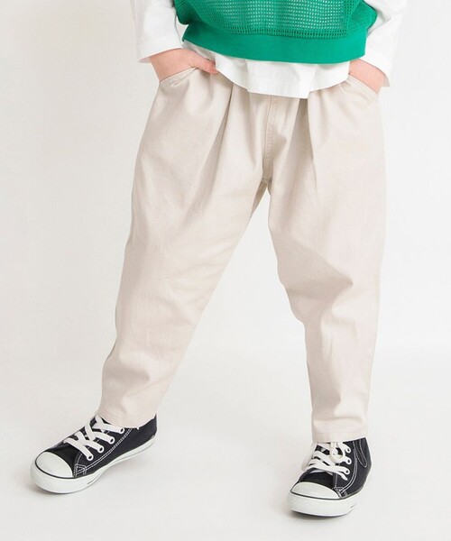 ■ポイント 股上を深めに設定したタックパンツです。 腿周りにゆとりを持たせたテーパードシルエットで 活発なお子さまにもおすすめのデザインです。 シンプルだからこそ着回しやすく、 デイリー使いにも◎ ツイル素材を使用しているので丈夫で、 オールシーズン着用できる素材感も おすすめのポイントです。 ■素材 本体部分「綿100%」 「吸汗性」にすぐれ「肌ざわりが良い」 生地を使用しています。 丈夫で型崩れしにくい、 お洗濯にもぴったりの素材です。 ----- ポケット:あり ウエストゴム調整:可 ※モデル着用写真についてはイメージの為、実際の 商品とカラーや仕様が異なる場合がございますので、 商品画像をご覧ください。 ※商品の色味につきまして、お客様のお使いのPCの モニター環境により実際のカラーと画像の色味が 違って見える場合が御座います。 予めご了承の上、ご注文下さい。 ※店頭・外での撮影画像は光の加減で、 実際の商品より明るく見える場合が御座います。 子ども/子供/こども/子供服/キッズ/ジュニア/男の子/女の子