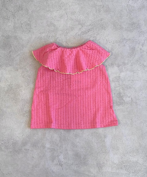 【HOGAN RANCH WEAR】コットン100%で柔らかいデコボコのサッカー生地♪人気アイテム!大きなフリルカラーがポイント♪カラフル-な配色が目を引くマーキーズらしいアイテムです。大きなふんわりボリューム衿がガーリーな印象に。衿に施されたメロー配色もポイントです♪サッカー生地特有の凸凹の生地感が◎肌ざわりがよく伸縮性もあるので着心地バツグンです!デニムと合わせたシンプルコーデもキマります♪春はカーディガンなどと合わせて衿を出すと、とっても可愛く長いシーズン着られます。メローカラーの組み合わせが可愛くてどれにしようか迷ってしまうアイテムです。。。■モデル着用アイテム・ストレッチストレートパンツ:0110131020・防汚加工ラウンドプリントTシャツ:0110341007※モデル着画写真は、照明や天候等により実際の商品と色味が若干異なる場合がございます。平置き画像が実物に近いお色味になっております。