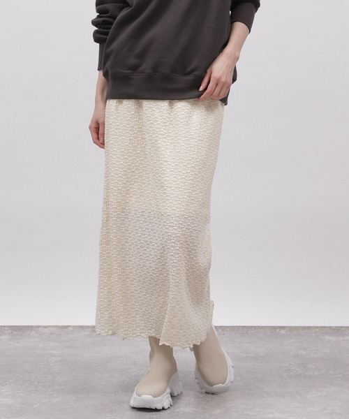 花柄の表面感が特徴的なスカート。ウエストがゴム仕様なので着脱が楽な1枚です。細身のナローシルエットでも伸縮性がありバックスリットで足さばきも良く、窮屈さなくお穿きいただけるのもポイント。総柄がスタイリングのアクセントにもなるアイテムです。【素材】柔らかく伸縮性のあるカットレースの素材。ポコポコとした凹凸のある花柄です。【スタイリング】ルーズなシャツやオーバーサイズニット、ウラケとの合わせがこなれ感が出ておすすめ。同素材のトップスを合わせたセットアップスタイルも〇