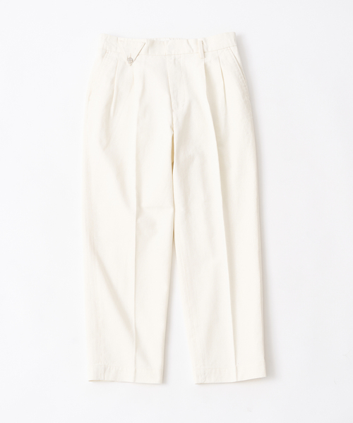 ”クリーンにもカジュアルにも着用できる、イージーデニムパンツ” ウエストはイージー仕様で、着脱も楽で着こなしのポイントにもなります。 すっきりとしたテーパードシルエット、ウェストにはタックが2本入り上品なスラックスの雰囲気も併せ持ちます。 シーズン問わず着用が可能な、綿100%デニム素材を使用。 キレイめなスタイル、カジュアルスタイルなどあらゆるテイストのトップスやアウターとのスタイリングに相応しい1本となっています。 ********************** ・透け感:なし ・裏地:なし ・伸縮性:なし ・光沢感:なし ・生地の厚さ: ふつう ********************** 本体:洗濯機洗い(弱)