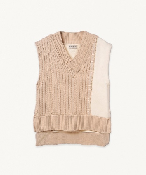 バイカラーデザインのオーバーサイズニットベスト。 アラン編みと天竺編みの2種類の編み地をアシメトリーに繋ぎ合わせ、バイカラーにしたデザイン。 ・後ろに付くTmレザーパッチ ※商品を受け取ってから8日以上が経った商品、ブランドタグや梱包を失くされた商品、また、着用感が見られる商品は返品交換を受け付けられないことがございます。予めご了承くださいませ。 【FORSOMEONE(フォーサムワン) 】 2018年秋冬コレクションより本格始動した ボーダーレスでジェンダーレスなブランド。 「ニュー レガシー」をテーマに掲げ、UKやUSのカルチャー、ヴィンテージにインスパイアされたFORSOMEONEはスタイリッシュでコンフィでありながらもアーバンな品格を持ち合わせたラグジュアリーなコレクションを発表。