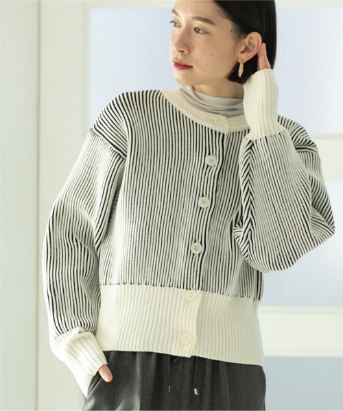 配色リブ編みがキャッチーな2WAYニットカーディガン【デザイン】・二配色のリブ編みがポイントの2WAYニットカーディガン・前後2WAYでニットプルオーバーとしても着用して頂けます。・短めの着丈とゆとりあるボリュームスリーブのゆったりしたシルエットが、トレンドのカジュアルスタイルにぴったり。・大きめサイズのボタンは、同色系の染めボタン【素材】・構築的なシルエットがでるポリエステル糸を使用・リサイクルポリエステルを含むサスティナブル素材・ご家庭でお手入れ簡単なマシンウォッシャブル素材------------------【C(シー) OPAQUE.CLIP】「PLAYFUL FEMININE」をキーワードに、天然素材と美しくポジティブなカラー、ワクワクするようなディティールや、ミックス感のあるスタイルなどファッションの楽しさを詰め込んだ新レーベルです。モデル情報:身長165cm B72 W57 H84 着用サイズ:38(M)店舗へのお問い合わせ商品番号:637-38006●製品寸法:36(S):着丈51cm B96cm 袖丈53cm 肩幅45cm38(M):着丈53cm B100cm 袖丈54cm 肩幅47cm40(L):着丈55cm B104cm 袖丈55cm 肩幅49cm備考:
