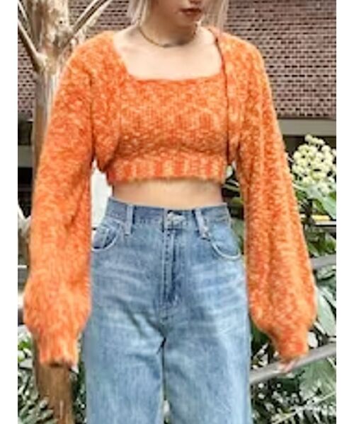ラメ糸を混ぜたシャギー素材のニットトップスです。クロップド素材のビスチェとボレロカーデがセットになっており、ビスチェはアウターのインナーとして、ボレロは羽織としても多様に着用して頂けます。カラー展開がパキっとしておりEVRIS(エヴリス)らしい配色もポイントです。