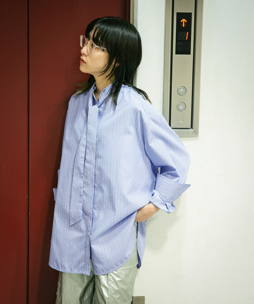 【春らしいコーデを完成させるストライプ柄のボウタイシャツ】 シワが気になりにくい素材で仕上げたボウタイのストライプシャツ。ゆとりのあるオーバーサイズ×大人っぽさを演出するボウタイとのバランスが可愛いです。ジャケットやコートを羽織っても重く見えない、明るめのBEIGEとBLUEの2色展開です。 COORDINATE デニムジャケットやトラックパンツなど、カジュアルなアイテムを組み合わせると一層こなれた印象に。ボウタイは片輪結びやネクタイをゆるく巻いたように結ぶのがおすすめです。 【2024 Spring/Summer】【24SS】 ※この商品(BEIGE)は、高温多湿の場所で長期間保管すると他の衣類に色移りすることがありますのでご注意ください。 ※保管する際は、ハンガーにかけ、ゆったりとスペースをとって吊るしてください。 ※その他お取り扱いに関しましては、商品に付属のアテンションタグをご覧ください。 ※商品画像は、光の当たり具合やパソコンなどの閲覧環境により、実際の色味と異なって見える場合がございます。予めご了承ください。 ※商品の色味の目安は、商品単体の画像をご参照ください。 ▼お気に入り登録のおすすめ▼ お気に入り登録商品は、マイページにて現在の価格情報や在庫状況の確認が可能です。 お買い物リストの管理に是非ご利用下さい。 素材感 透け感 : なし 伸縮性 : なし 裏地 : なし 光沢 : なし ポケット : なし