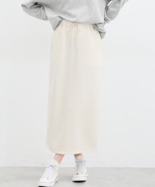 人気のきれいめスウェット 【デザイン】 ストンと落ちる、すっきりIラインシルエット。 ウエストのスピンドルとポケットや裾のステッチが大人可愛いアクセント。 【素材・機能】 両面が滑らかな、綿混きれいめスウェット素材。 ウエストゴムとバックベンツでストレスフリーなはき心地。 【スタイル】 Tシャツ合わせのカジュアルから、コンパクトトップス合わせの上品スタイルまで、幅広く活躍。 ふんわりブラウスと合わせるのも◎ ※ウエスト部分ゴム ※裾後中心ベンツあり ●裏地/なし 品番:585-23-8787