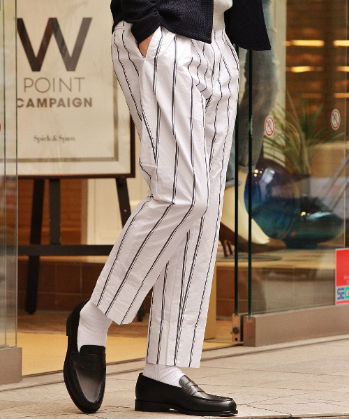 EDIFICE(エディフィス) クラシカルなワイドストライプ柄がアートな雰囲気を演出してくれるカジュアルパンツ。タックを入れることで適度なゆとりを生み、動きやすさを加味させています。アンクル丈のスッキリとしたデザインは革靴やサンダルなどとも相性がよく、コーディネートに幅を持たせてくれます。シャツやカーデイガンなどと合わせたリラックス感のあるスタイリングから、ジャケットなどと合わせたシックなスタイリングなどにもお勧めです。