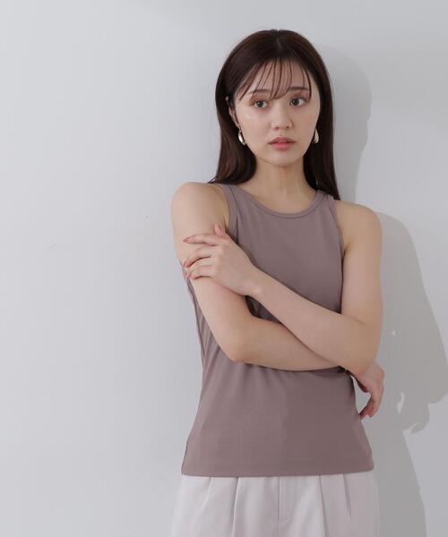 リブカットソーで仕立てたカップ付きタンクトップ。肩や鎖骨がキレイに見えるように、アメリカンスリーブ風のラインに拘ったシンプルなデザインです。下着に悩まなくて良いデザインは1枚で使いやすく、長いシーズン活躍できます。