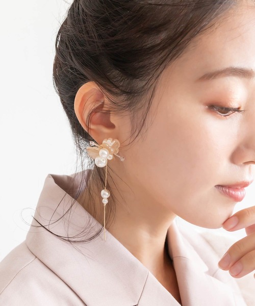 ◆2024SS新商品◆2WAYフラワーピアスPOINT・フラワーパーツがポイントのピアス・ピンクにはパールを、クリアには同素材のパーツを施しフェミニンな印象に・2WAYで楽しめる2種類のキャッチ付き・華奢なチェーンの揺れ感が上品・シーズンムード高まるピンクとクリアの2色展開・ポスト部分にチタンを使用