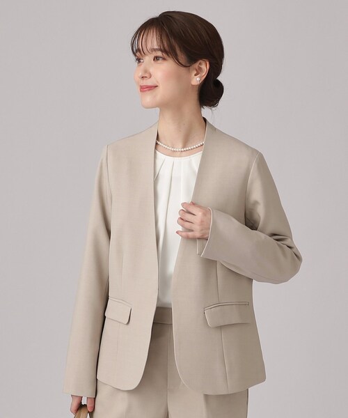 【デザイン】 すっきりとしたVラインが美しいカラーレスのジャケットです。 身体のラインを綺麗に見せてくれる、きちんと感のあるジャケットです。 フロントはホックで留められます。 お袖口にはスリットが入っているので、折り返して袖丈を調整して着ていただけます。 ※ポケット数:横×2 【スタイリング】 同素材のテーパードパンツと合わせ、セットアップとして着用いただくとクールなきれいめスタイルで着ていただけます。 ワンピースやひざ下丈のスカートと合わせていただくと女性らしさのあるきれいめスタイルにもマッチします。 入卒シーンや学校行事はもちろん、オフィスカジュアルコーデにもおすすめです。 【セットアップで着ていただける同素材アイテム】 ・パンツ 741-68200【素材】 さらさらとしたドライタッチのツイル素材。 マシンウォッシャブル可。 細い糸を使用しているので軽く身体になじむドレープ性があり、 シルエットをきれいに見せてくれる上品な素材です。 ナチュラルストレッチなので快適に着ていただけます。 ※裏地:総裏仕立て #通勤#セレモニー#ママスーツ#入卒#卒園式#卒業式#入学式#入園式#学校訪問服#パーティドレス#フォーマルレディス#結婚式#七五三#ママ#母スーツ モデル情報:身長166cm B80 W59 H85 着用サイズ:02(M) 店舗へのお問い合わせ商品番号:741-48200 ●製品寸法: 02(M):着丈59cm B99cm 袖丈59cm 肩幅38cm 03(L):着丈60cm B103cm 袖丈60cm 肩幅39cm 04(LL):着丈61cm B107cm 袖丈61cm 肩幅40cm 備考:重量:サンプルサイズ約385g