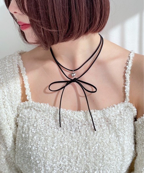 ーーー【デザイン】チョーカー風のデザインが可愛いネックレス。ハートのチャームとリボンのディティールが2連になっているので、顔周りを華やかに演出してくれます。ーーーTシャツやシンプルなトップスのアクセントにおすすめ!※屋外の光や照明の当たり具合で、実際の商品と画像の色味に違いが発生する場合がございます。