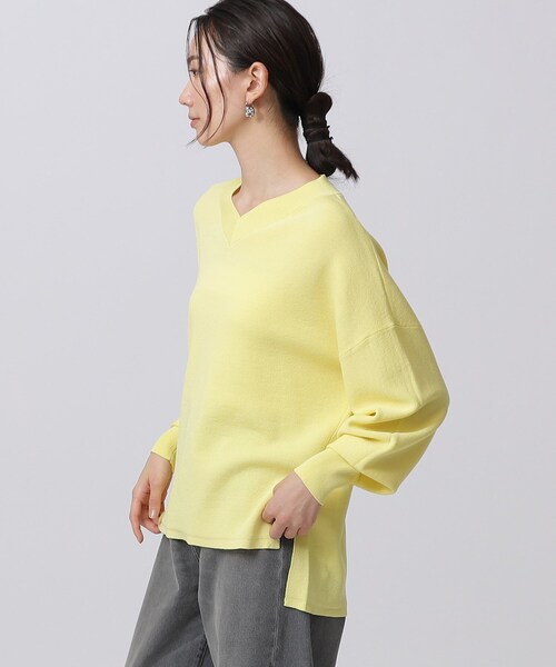 Design Point袖のボリュームがポイントのVネックニット。袖はジャカード編みにして大胆な立体感を出し、長めの袖口リブとのバランスがトレンドフォルムを作っています。オフボディで着やすくほどよくすっきりと仕上げました。Styling Pointワイドパンツやストレートスカートと合わせてストレートラインにまとめた着こなしがおすすめ。デニムと合わせたカジュアルスタイルもデイリーに活躍します。Fabric Pointレーヨンナイロン素材にポリエステル糸を組み合わせスムース組織。ほどよい肉感とハリ感を出した肌触りの良い素材です。モデル情報:身長170cm B82 W60 H89 着用サイズ:38(M)店舗へのお問い合わせ商品番号:523-18410●製品寸法:34(XS):着丈58cm B114cm 袖丈45cm 裄丈79cm 肩幅63cm38(M):着丈59cm B118cm 袖丈46cm 裄丈80cm 肩幅65cm備考: