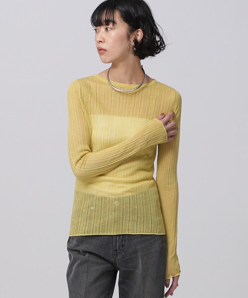 Design Point微光沢のある繊細な糸で仕立てたシアーニット。清涼感がありさらっとしたドライタッチな肌触りです。縦に長いシャキッとしたシルエットのベーシックなリブニットです。Styling Pointスラックスパンツやデニムにインするだけでトレンドのスタイリングに。キャミワンピースやジレにレイヤードしていただくのもおすすめです。Fabric Pointアクリルポリエステル糸を使った、さらっとドライタッチな風合いのニットです。※製品寸法は平置きのスペックとなっております。こちらの商品は伸縮性があります。モデル情報:身長170cm B74 W58 H83 着用サイズ:38店舗へのお問い合わせ商品番号:523-18425●製品寸法:38(M):着丈58cm B80cm 袖丈63cm 肩幅34cm備考: