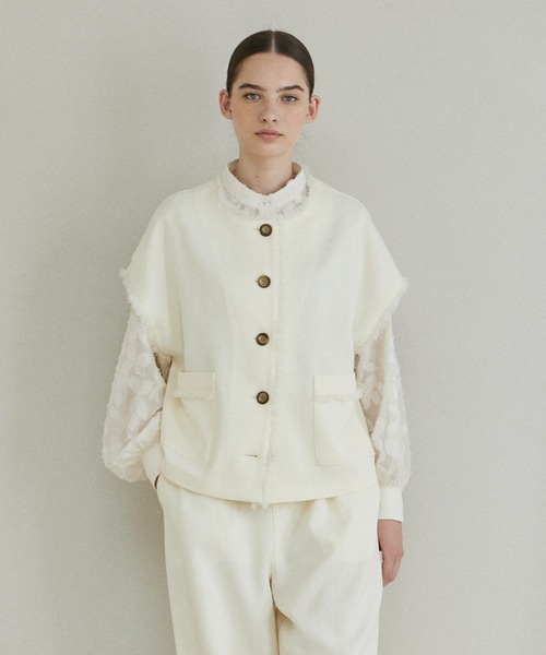 上品で軽やかさを感じるサマーツイード調の風合いが魅力のベスト。襟、袖口、裾、ポケットはトレンドのフリンジを効かせたデザインになっています。Tシャツやキャミソールをインナーに合わせたスタイリングはもちろん、ボタンを閉めてノースリーブトップスとしても着用いただけます。同素材のカフヘムパンツとのセットアップコーデもおすすめです。 透け感:なし 伸縮性:なし 裏地:なし 光沢:ややあり ポケット:あり洗濯方法:水洗い可 ▼セットアップ対応 同素材のパンツ品番:7142161514 ■サンプル撮影商品■ こちらの商品はサンプルでの撮影となっております。実際の商品とは、サイズや色味、素材、デザイン等の仕様が若干変更になる場合がございます。