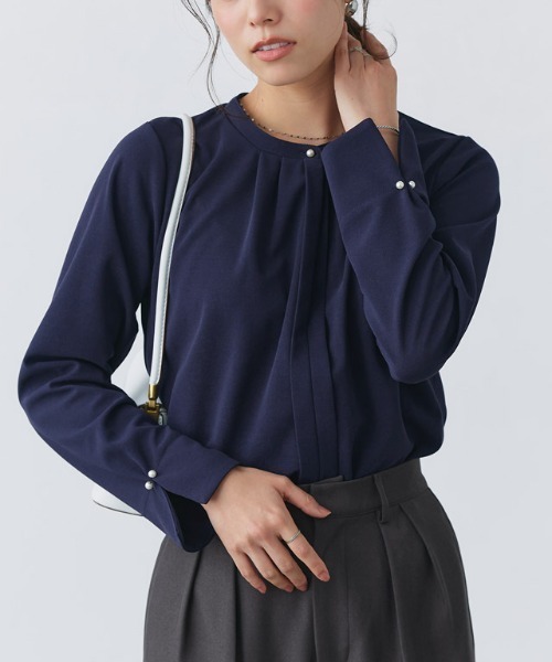 着回しバリエーション広がる“2wayネックデザインTブラウス” “カットソーなのにブラウス見え”を叶えるカットジョーゼット素材を使用。 程良い落ち感がきちんとした印象をプラスします。 伸縮性があり、裏面がさらっとした肌触りのブラウス。 シワになりにくく、お手入れが簡単なのにキレイ見えするところも魅力の一つです。 ボタンを留めて着用するときちんと感を演出でき、開いて着用すると程よくカジュアルさを出しながらも女性らしく。 襟元のタックデザインがアクセントになり、ノーカラーデザインで上品な雰囲気に仕上げました。 透け感(淡色):あり 透け感(濃色):なし 伸縮性:あり 裏地:なし ポケット:なし ファスナー:なし オフホワイト・グレー・ライトブルーに透け感が生じます。 【ブランド】 Pierrot(ピエロ) 【お買い物を楽しむための方法】 **商品のお気に入り登録** カートボタン横の♡をクリック! 気になるアイテムが完売しても再入荷のお知らせ通知や、在庫ラスト1点の通知、セールの通知が届きます。 **ブランドのお気に入り登録** ブランドトップページの「♡お気に入りブランドに追加」をクリック! 新商品や再入荷など、クーポン配布などのお得な情報を受け取ることができます。 ・洗濯:洗濯機使用可(ネット使用)