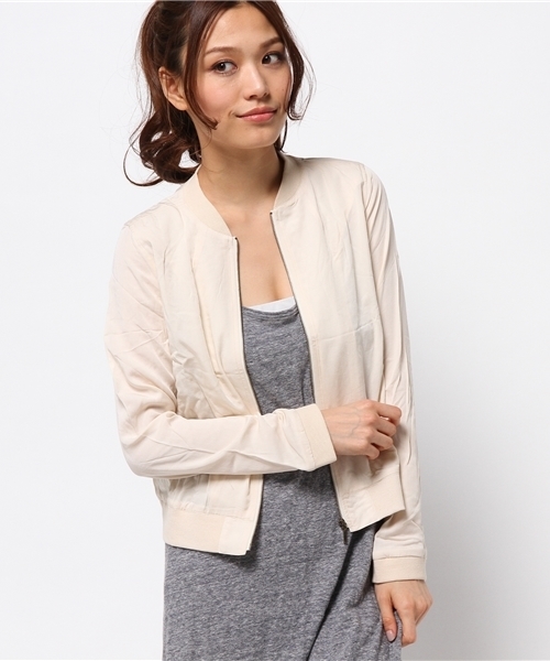 レーヨン素材のリブブルゾンです。軽いタッチのレーヨンツイル素材を使用しています。ショート丈でワンピースやスカートに合わせやすいデザインです。軽い素材を使用しているのでカーディガン感覚で着用して頂けます。スカートに合わせたスタイルがお勧めです。