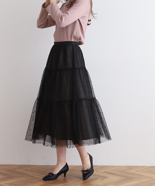 ドットのランダム刺繍を入れたティアードチュールスカート ~POINT~ 長すぎないミディ丈で身長関係なく、バランスよくお召し頂けます。 ウエストゴムなしのキレイめデザイン。一気に高見えもします。 カジュアルにスニーカー合わせも◎オンオフ兼用できるのがうれしい◎ 【ディティール・機能】 表面はオリジナルのランダムドット刺繍入り。 111番はラメ混の刺繍糸を使用・119番は同色黒の刺繍糸を使用しています。 中に無地チュールを挟んで、透けにくいサテン裏を使用しています。 ※後ろコンシールファスナー開き 【スタッフコメント】 ・maki(163 ) 春らしい軽やかな素材のチュールスカート。さり気ないドット柄でより華やかな印象に。 ブラックとグレーの二色なのでどちらも合わせ易いカラーです。カジュアルな合わせなら、パーカーやスウェット合わせもおすすめ◎ 【24SS NEW ARRIVAL】 【24SS NEW COLLECTION】 店舗へのお問い合わせ商品番号:508-78009 ●製品寸法: 36(S):総丈80cm W65cm H106cm 38(M):総丈82cm W68cm H109cm 40(L):総丈84cm W71cm H112cm 42(LL):総丈85cm W74cm H115cm 備考: