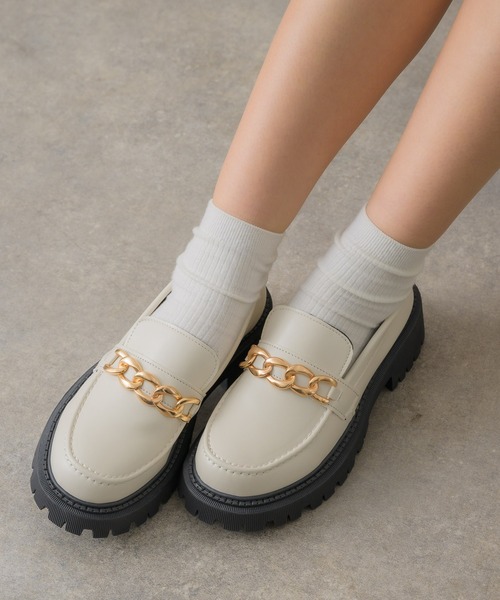 <ゴールドモチーフがポイントのチェーン付きローファー>▼デザイン上質感のあるレザーの風合いが上品なチェーン付きローファー!厚底でスタイルアップ効果も間違いなしです◎大きめ存在感のチェーンが足元をゴージャスに飾ります。程よくボリュームのあるアイテムです!▼コーディネートクラシカルな表情が様々なスタイリングにバランス良く馴染み、オンオフ問わずにデイリーに活躍するアイテム。低身長さんは、ロング丈のボトムを履くときにセレクトすることで、ボトムの着丈をちょうどよく着ていただけます。▼ブランド紹介RETRO GIRL (レトロガール)自分らしい“ベーシックアイテム”と新しい自分の”トレンドアイテム”が見つかる場所今らしいファッションを楽しむ女性のためのブランド#春アイテム #春コーデ #ローファーアイテム #スクールコーデ #ビットローファー #靴 #シューズ▼注意事項※撮影環境やモニター環境によって実際の商品とお色味が多少異なってみえる場合がございます。品番:RA456442B002 / 品名:チェーンローファー