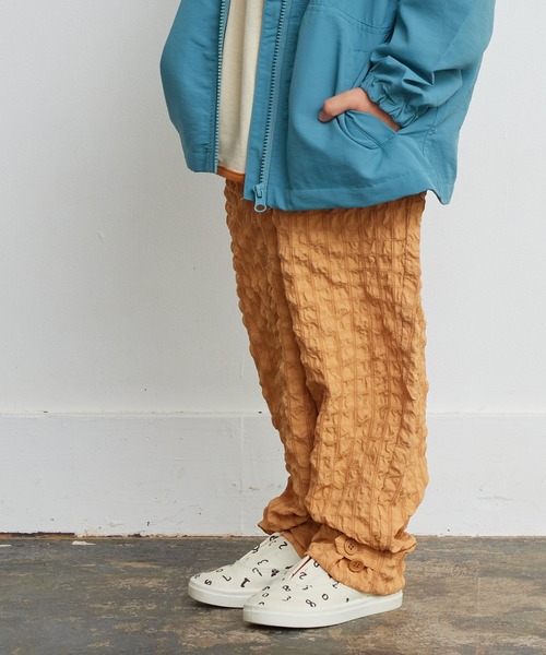 【CALMiA】 ぽこぼこシャーリングシリーズ! こちらは今年初登場のロングパンツ。 くしゅっとしたシャーリングが抜け感を演出。 ワイドシルエットで、裾回りはスッキリしたテーパードパンツ。 同素材のキャミチュニックとコーデするのもとってもオススメです。 ◆両サイドとバック右側にポケット付き ■同素材のチュニックはこちら! シャーリングキャミチュニック:0041141002 ■親子でリンクコーデもオススメです! 大人サイズ:0040141003 ■モデル着用アイテム ・防汚加工ラウンドロンティー:0110341005 ・メローリブハンソデカットソー:0010341130 ・【GERRY】スタンドウィンドブレーカー:0120641001