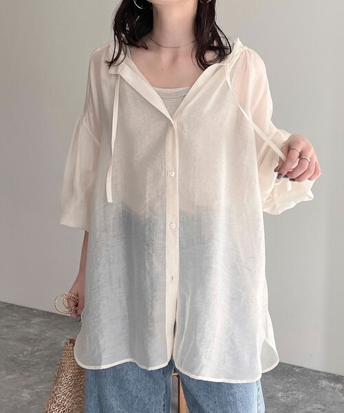 ◇fredy emue◇【2024 SS】シアーと衿のギャザーが大人可愛い前開きブラウス●point・トレンド感のあるシアー素材とふんわりしたシルエットがお洒落見えする1枚・身幅も程よくゆったり目で袖もボリュームがあり、肩回りを華奢見えさせてくれます・襟元の紐はそのままでも◎リボン結びにするとフェミニンな印象に!・程よい丈感でボトムを選ばず着用していただけます・1枚着でも◎羽織としても使えるのも嬉しいポイント!・春夏はキャミソールに羽織ったり、まだ寒い時期にはニットやTシャツ合わせのレイヤードスタイルもオススメです・キレイ目にもカジュアルにも着こなせて、オンオフ問わず使用していただけます・コーディネートに取り入れるだけでトレンド感がアップする1枚あると便利なアイテムです透け感:あり裏地:なし伸縮性:なし光沢感:なし洗濯:手洗い可●お取扱い上のご注意●*商品を長くご愛用していただきたいため、アテンションタグがある場合は必ずご確認の上、着用又はお取り扱い下さい。*画像の商品はサンプルとなりますので実際の商品と仕様(主にファスナー・釦等の付属品)、加工、サイズが若干異なる場合がございます。*店頭及び屋外での撮影画像は、光の当たり具合で色味が違って見える場合があります。商品の色味は、スタジオ撮影の画像をご参照下さい。*商品画像に関しては出来る限り忠実に表示出来るよう努めておりますが、お客様がご利用のモニターの設定及び特性により、実際の商品と比較し色味に若干の誤差が生じる場合があります。*製品洗い加工の商品は、多少の歪み、シワなどが見られたり、風合いやサイズ等が1枚1枚異なります。汗や雨等で濡れた時や、摩擦により色落ちし、他の衣料を汚すことがありますので(特に濃色のもの)ご注意ください。◇商品のお気に入り登録◇【お気に入りに登録 ♡マークをクリック】を是非ご活用ください! 再入荷の通知や、ラスト1点の通知、セールの通知がいち早く届きます。◇ブランドのお気に入り登録◇新商品や再入荷など、いち早くブランドのお得情報が届きます。