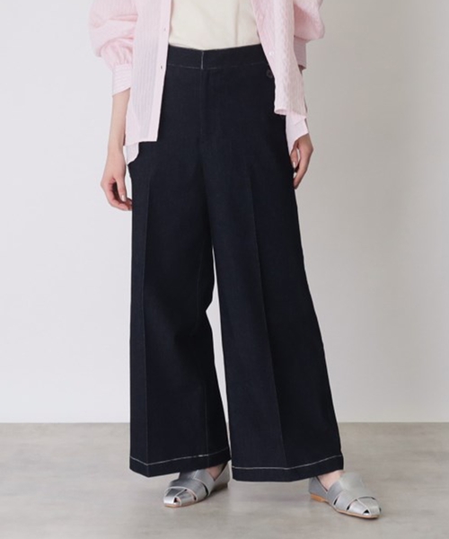 ■Point/Detail デニム素材のセンタープレスがきれいなワイドパンツ。 脇のボタン仕様のマリンパンツ型です。 配色のステッチがポイントです。 ※ポケット数:横×2 ■Fablic/Function ストレッチ感があります。 ※裏地なし ■Cordinate すっきりとしたニットやTシャツとの相性◎ モデル情報:身長164cm B76 W58 H86 着用サイズ:12(M) 店舗へのお問い合わせ商品番号:040-68010 ●製品寸法: 11(S):W64~68cm H88cm 股下65cm 前股上30cm 渡り幅32cm 裾幅29cm 12(M):W67~71cm H90cm 股下66cm 前股上30cm 渡り幅33cm 裾幅29cm 13(L):W70~74cm H93cm 股下67cm 前股上31cm 渡り幅34cm 裾幅30cm 14(XL):W74~78cm H96cm 股下68cm 前股上31cm 渡り幅35cm 裾幅30cm 備考: