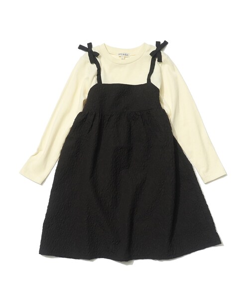 【デザイン】凹凸感のあるエンボス素材のキャミワンピースとロンTをレイヤードコーデしたような1枚着のドッキングワンピースです。肩紐部分はリボンディティールがアクセントになって、シンプルながら可愛さを詰め込んだデザインアイテム。これ1つでトレンドコーデが完成しちゃうのでコーディネートが苦手な方にもおススメです♪※ポケットなし【素材】さらっとした天竺の綿混カットソー素材と凹凸感のあるエンボスジャカード素材をドッキングしています。※裏地なし※サックスブルー(090)はやや透け感があるため、インナーの着用をおすすめします。店舗へのお問い合わせ商品番号:122-58032●製品寸法:11(110cm):着丈64cm B62cm 袖丈38cm 肩幅25cm W64cm H86cm12(120cm):着丈70cm B66cm 袖丈42cm 肩幅27cm W72cm H92cm13(130cm):着丈75cm B69cm 袖丈46cm 肩幅29cm W79cm H98cm14(140cm):着丈80cm B72cm 袖丈49cm 肩幅30cm W86cm H104cm備考: