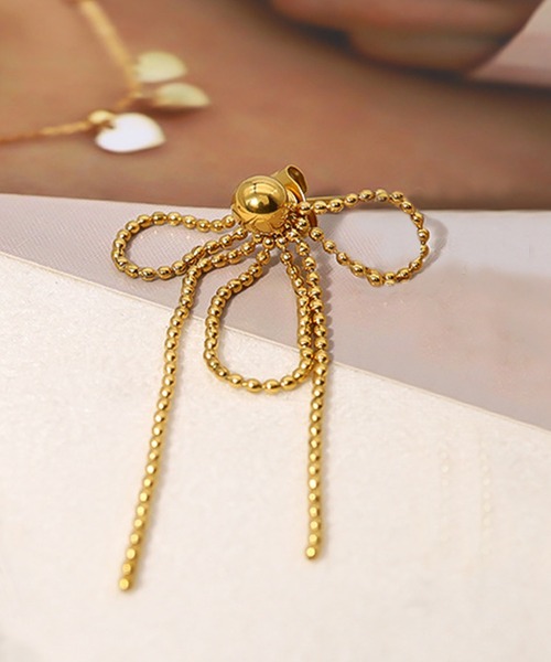 ボールチェーンをリボンの形にしたリボンチェーンピアスです。シンプルながらも存在感のあるデザインで揺れ感が女性らしさを演出してくれます。チェーンチャームの部分をピアスの後ろでも、前でも、お手持ちのピアスと組み合わせてもおすすめです。メタルピアスとしてチャームなしでも重宝します。- - - - - - - - - - - - - - - - - - - - - - - - - - - -大ぶり 存在感 ボールチェーン リボン ピアス ゴールド シンプル 片耳用 揺れ感 華奢 韓国 韓国ファッション- - - - - - - - - - - - - - - - - - - - - - - - - - - -【ご注文の際のご注意】当商品は海外生産の製品となり軽微な傷、汚れがある場合がございます。照明やモニターの写り具合により、画像と実際の商品の色が多少違って見える場合がございます。以上、ご了承の上ご購入をお願い致します。- - - - - - - - - - - - - - - - - - - - - - - - - - - -◆商品のお気に入り登録(ハートマークをクリック)お気に入りアイテムの完売カラーの再入荷通知や、ラスト1点の通知、セールの通知を受け取ることができます。◆ブランドのお気に入り登録新商品や再入荷など、お得な情報を受け取ることができます。◆DiamondHeartsDiamondHeartsは韓国ファッションを気軽に楽しめる女性のためのファストファッションブランドです。流行を取り入れつつリーズナブルな価格帯が特徴となっております。ear-008-1