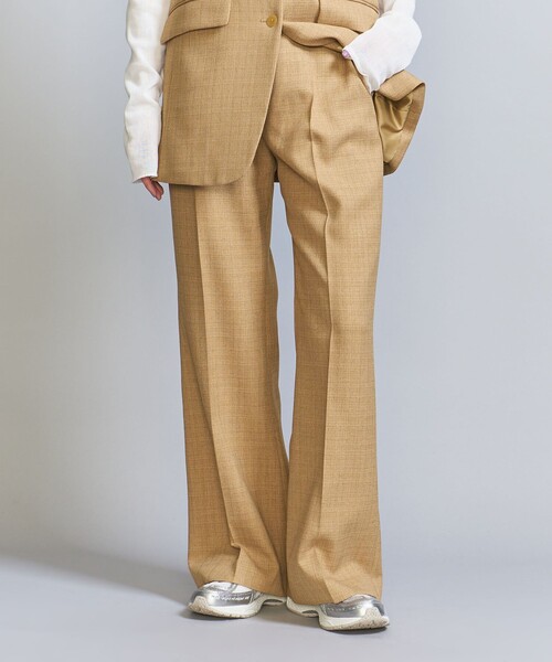 ノータックですっきりと決まる美脚シルエットパンツ ■デザイン 裾に向かって緩やかなフレアが美しいレッグラインを演出するパンツ。 タックの無いすっきりとした腰回りでフィット感のあるルックスが特徴です。 ダーツを利用したピンタックからのセンタープレスもポイント。 装飾をはぶいたシンプルなデザインは様々なトップスに合わせられます。 デイリー使いに嬉しいポケット付きです。 ■素材 麻調合繊素材。 ツィードライクなオレンジ味の強い深みのあるカラーが魅力です。 ■コーディネート ジャケットとベストと3ピースで新鮮なセットアップスタイルを楽しむのがおすすめ。 春ニットを合わせたシーズンライクな着こなしもぜひ。 ・同素材のジャケット(対象品番:16221441105)とチューブトップ(対象品番:16211441111)のご用意もございます。 ・生地が異なりますが、(対象品番:16141446228)と同デザインです。 #春服 ============================ 裏地:なし 透け感:なし 伸縮:なし 光沢感:なし ============================ 【注意事項】 ※商品を使用前に、タグ等に記載されている「取り扱い上の注意書き」、「洗濯表示」を必ずご確認ください。 ※商品画像は、光の当たり具合やパソコンなどの閲覧環境により、実際の色味と異なって見える場合がございます。あらかじめご了承ください。 ※商品の色味の目安は、商品単体の画像をご参照ください。 店舗へお問い合わせの際は、全国のBEAUTY&YOUTH各店舗まで下記の品名/品番をお申し付けください。 品名:BL PE FLR PT 品番:16141446227