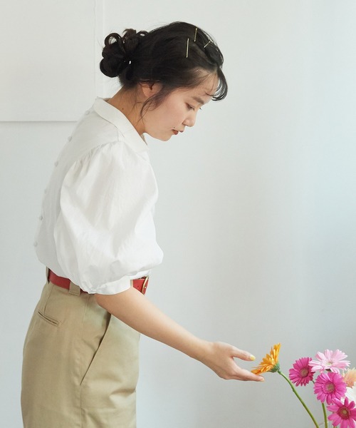 ギャザーがたっぷりと入ったボリューム感のある5分袖ブラウス。後ろのくるみ釦やお袖など可愛らしさを持ちつつ、ピシッとしたシャツ地を使用したことで、CHILD WOMANらしく甘くなりすぎないデザインに落とし込みました。凛とした上品な雰囲気でキチンと感がありつつも綺麗めになり過ぎない絶妙なバランスが魅力です。生地はナイルで採れるエジプト綿「FINX」を使用しました。「FINX」とは、柔らかくふくらみのある風合いが特徴で、綿花はひとつひとつ丁寧に手摘みされた最高級の素材です。ボトムスにインでもアウトでも着れるよう丈感も調整し、その日の気分で楽しめます。ボリュームがありガーリーな印象なので、デニムやカーゴパンツなどカジュアルボトムとのスタイリングもオススメです◎【素材の特性・お取り扱いの注意】・取り扱いの注意については取り扱い表示をよくご確認の上、着用をお願い致します。※撮影画像は、光の当たり具合やモニターの環境により色味が違って見える場合があります。あらかじめご了承ください。※着用の商品はサンプルで撮影しております。お届けする実際の商品と仕様、加工、サイズが若干異なる場合がございます。 サンプルからの修正点→ホワイト、ピンクの袖口の明きを無くします。正しい仕様は詳細画像をご参照ください。
