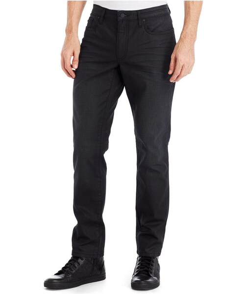 Coated with a slim fit. Upgrade your denim closet with these black washed jeans from Kenneth Cole. Cotton/elastic Machine washable Imported Kenneth Cole coated jeans Zip fly with button closure; belt loops Five-pocket styling; single welt pocket at back Slim cut Subtle fading down leg Creasing at thigh