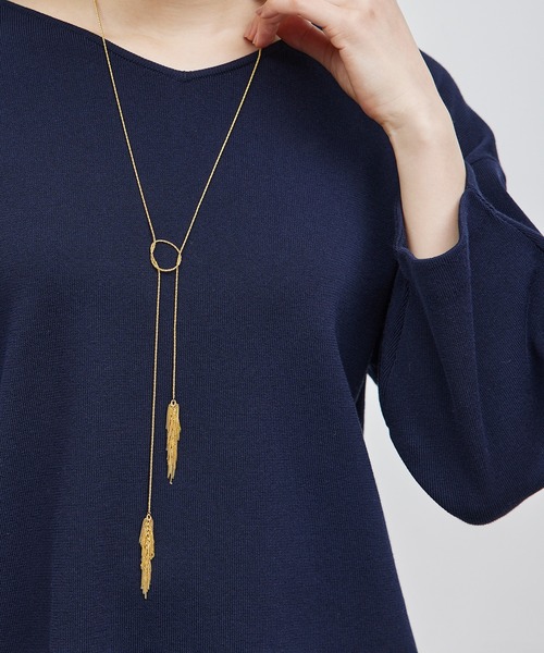自分好みにいろいろアレンジできる、付け方に縛られない進化系ネックレス【素材】 真鍮地金にゴールドプレーティングまたはシルバープレーティング加工を施しています。 【デザイン・シルエット】 チェーンを1本1本手作業でフリンジ風に加工したモチーフを両サイドの先端に使用。アレンジ次第でラリエット風に着けたり、二つ折りにしてショートネックレス風に着けたり、さまざまなデザインを楽しめるマルチWAYネックレスです。程よいフリンジのボリューム感で繊細なチェーンがさりげなく揺れるデザイン。 【カラー】 ゴールド、シルバーの2色展開 ※画像の商品はサンプルです。実際の商品と仕様、加工、サイズが異なる場合がございます。 ※撮影場所やライティング、お使いのモニター環境によって色の見え方が異なる場合がございます。 ※商品のカラーは画像の色味をご参照ください。動画は仕様説明のため、色味が実物と異なる場合がございます。