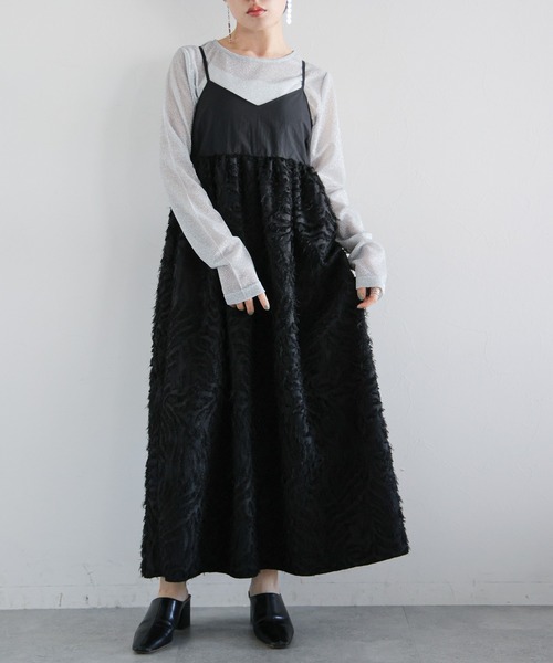 ■ポイント ・歩くたびにふんわりと揺れるキャミソールワンピース ・フリンジドッキングのデザインで、こなれ感UP! ・しわになりにくく、きれいなドレープ感が大人お洒落な雰囲気 ・華奢なストラップで女性らしい印象に! ・バックはゴム仕様&サイドジップ付きなので、楽な着心地◎ ・フレアに広がるシルエットで、体のラインを拾わない! ・普段使いはもちろん、ちょっとしたオケージョンシーンやパーティーなどでも活躍するアイテムです◎ ■素材 毛足の長いフリンジ素材で仕上げ、一枚でお洒落見えするキャミワンピース! 程よく厚実のある生地感で、ロングシーズン着用いただけます◎ ベーシックに着回しやすい、ホワイトとブラックの2色展開です。 ーーー ■スタイリング 合わせ方次第で、キレイめからカジュアルコーデまで楽しめる一着。 シアーインナーやジャケット、ニットと合わせたスタイリングはもちろん、 スウェットやデニムをレイヤードしても◎ トラックジャケットと合わせた、スポーツミックスコーデも今年らしくておすすめです!