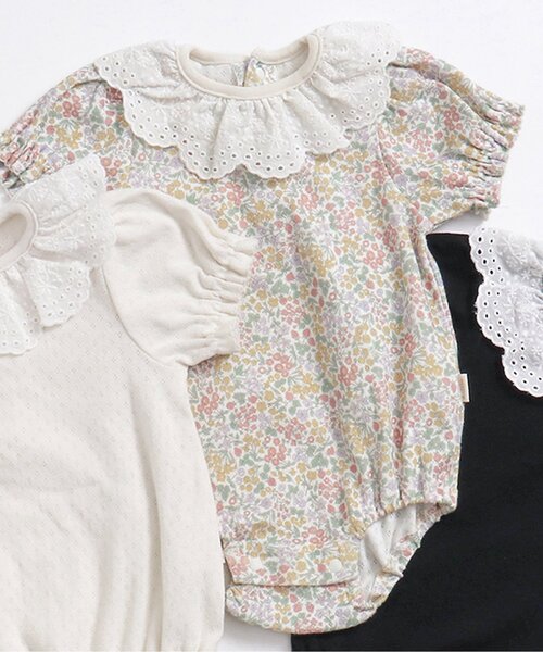 フリル衿がとってもキュートなボディスーツ♡ 無地デザインでシーンを選ばない ブラックとアイボリーに加えて 優しい印象のお花柄も♪ 優しいカラー配色がかわいいお花柄は よーーく見ると、お花柄にいちごやさくらんぼが ひっそりと隠れているデザインに🍒 1枚で着ても合わせても可愛いボディースーツは 出産のお祝いや記念日などのプレゼントにもおすすめです◎