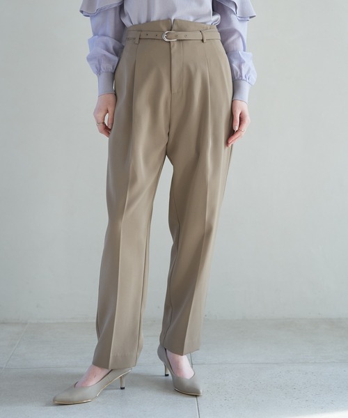 ハイウエストデザインのテーパードパンツ。 ウエスト部分のスリットがすっきりとした印象をプラスします。 落ち感のある素材を使用し、きれいめに着こなせるのも魅力です。 共地ベルト付きでオフィスにもおすすめ。ベーシックでオンにもオフにも使いやすい1着です。 透け感[無し] 裏地[すべて有り] 伸縮性[無し] 光沢感[やや有り] 生地の厚さ[普通] 付属品[有り]ベルト ポケット[有り]前2つ 後フェイク2つ ●製品寸法: S:ウエスト66 ヒップ97 総丈97 股下67 わたり周り33 裾幅17.5 M:ウエスト70 ヒップ106.2 総丈101.5 股下68.5 わたり周り34.2 裾幅18 備考: