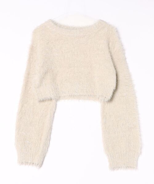 ルーズシルエットのショートニットです。トレンドのラメ糸を使用。シャギーとラメ糸をミックスさせることで柔らかく、優しい肌当たりが特徴です。とろみのある女性らしい雰囲気で、1枚でのスタイリングからインナー使いもおすすめ。