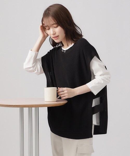 【デザイン】 ニットベストとロンTのレイヤードセット。 ニットベストは、ゆったりしたシルエットでリラックスして着ていただけるサイズ感。 首元はすっきりみえるクルーネックで、肩のラインを華奢見えに女性らしくみせるデザインにこだわりました。 脇部分は、テープ状の編地2本で前後をつなげたデザインで、横から見たときも雰囲気があり、大人っぽい抜け感あるコーデが叶います。 寒い時期から暖かい時期まで着まわせるよう、シンプルな畦編みでおつくりしたのもこだわりポイントです。 【スタイリング】 ニットベストはヒップをカバーする着丈がありながら、脇のデザインにより、抜け感があるコーデが簡単につくれます ボトムには細身パンツやデニムでカジュアルコーデはもちろん、テーパードでオフィスカジュアルやお出かけ着としても。 ワイドパンツやロングスカートでも、脇ディテールによりに、重たく見えずバランスよく着ていただけます。 ニット単品で、ロングシャツワンピースの上に重ね着のも清潔感があっておすすめです。 【素材】 ニットベストは、リネンライクなアクリル糸で編みたてたドライタッチな畦編み。 インナーのロンTは肌当たりのよいジャージ素材を使用しています。 モデル情報:身長166cm B80 W59 H85 着用サイズ:02(M) 店舗へのお問い合わせ商品番号:C62-18321 ●製品寸法: 02(M):カットソー着丈60cm カットソーB94cm カットソー袖丈56cm カットソー肩幅40cm ベスト着丈65cm ベストB104cm ベスト肩幅57cm 03(L):カットソー着丈61cm カットソーB99cm カットソー袖丈56cm カットソー肩幅40cm ベスト着丈66cm ベストB106cm ベスト肩幅57cm 04(LL):カットソー着丈63cm カットソーB104cm カットソー袖丈57cm カットソー肩幅40cm ベスト着丈67cm ベストB108cm ベスト肩幅57cm 備考: