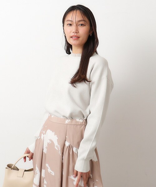 1枚でレイヤードが完成!シアーフリル使いの華やかなラメニットプルオーバー 【デザイン】 ・細ラメ糸を引き揃えたラウンドニットに、シアーなリブ編みニットをフリル使いにしてドッキングさせた1枚でレイヤードが決まるニットプルオーバー。 ・細ラメ糸を使用している為、上品な光沢感で着合わせもし易く、華やかさがあるのも魅力。 ・ややゆとりのあるシルエットとドロップショルダーデザインで、きれいめからカジュアルまでスタイリングも可能です。 【素材】 ・きれいな光沢感のあるレーヨン混素材で、細ラメ糸を引き揃えたニット ・ジャカード編みで表面感もあり、しっかり肉感のある仕上げりに。 ・衿フリル部分には、シアー感のあるリブ編みにし、衿ぐりにドッキングさせています。 ・マシンウオッシャブルでご自宅でのお洗濯も可能 モデル情報:身長167cm B84 W62 H88 着用サイズ:38(M) 店舗へのお問い合わせ商品番号:637-18028 ●製品寸法: 38(M):着丈56cm B102cm 袖丈53cm 肩幅48cm 40(L):着丈57cm B104cm 袖丈53cm 肩幅50cm 備考: