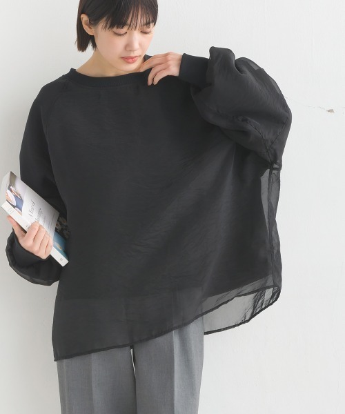 \新色ブルー追加!!/【ポイント】滑らかで着心地の良いダンボール生地の上から、繊細なオーガンジー生地をドッキングした今年らしい1枚。ボリュームがありながらもラグランスリーブで、肩回りはスッキリとした表情です。また、たっぷりのボリュームスリーブデザインが特徴裾は内側と外側の長さを変えることで、ボトムを合わせた時に美しいコントラストが出る仕様。【コーディネート】ヒップにかかる着丈はスカートともパンツとも相性が良くテイストを問わず幅広い着こなしを楽しめます。カジュアルが苦手な方でも挑戦しやすいアイテムです。サイズに記載があるのは外側部分(オーガンジー)です。 着丈:66 /身幅:71/ 裄丈:83 内側部分のサイズはこちらです。 着丈:59/ 身幅:56 /裄丈:70【人気商品・完売カラ-のお気に入り登録】随時、入庫はしていますが人気のため完売しやすくなっています!!お気に入り登録の♥をクリックしていただくと通知がきて、すぐにご購入いただけます!あとは商品が届くのを待つだけ♪ぜひご登録ください!【ブランドのお気に入り登録】新商品や再入荷など、最新情報・お得情報をいち早くお知らせします!ぜひご登録ください!------------------------------------------※掲載画像の商品の色味は、屋外や屋内の光の照射や角度により実物と色味が異なる場合がございます。また表示のサイズ感と実物は若干異なる場合もございますので、予めご了承ください。