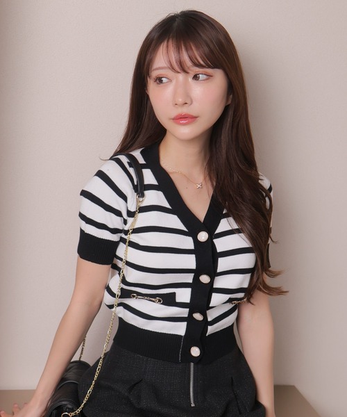 【point/coordinate】・バイカラーデザインでメリハリ。・コンパクトなサイズ感でどんなコーデでも合わせやすい。・デコルテが開いているので首元すっきりして女性らしい。・袖は短すぎない丈感で二の腕カバーになる。・フェイクポケットにはVITがついていてワンポイント。・ゴールド縁のマーブルボタンできらっとアクセントに。・ボタンで開け閉めできるのでカーデとしてもトップスとしても着れる。・ブラックとホワイトはバイカラーパイピング配色でクラシカルな雰囲気に。・MIX1はボーダーでマリンライクで春夏らしい。【fabric】・アクリル、コットンの糸を使用。・さらっとした肌触りで着心地が良く夏でもべたつかない。