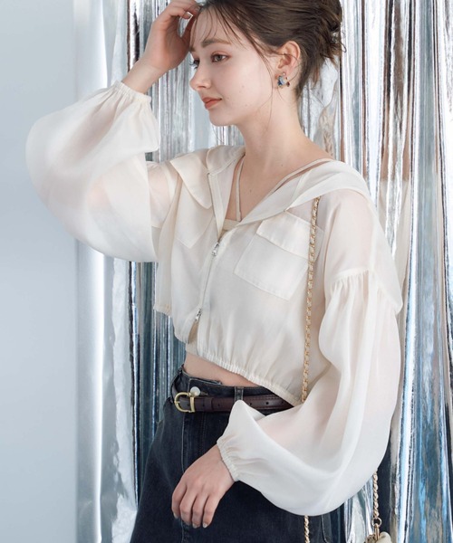 ■人気のシアーフーディが今年も登場■ 今季トレンドのスポーツスタイルにもぴったりなフーディ。 シアーの透け感とツヤのある素材が女性らしく着こなせる一枚です。 腰上の短丈でスタイルアップ効果抜群。 袖のボリュームとのアンバランスさがこなれ感を出してくれます。 袖口と裾にゴムが入っているので全体的に丸みのあるシルエットが可愛らしい印象に。 ダブルジップで着こなしの変化を楽しめるデザイン。 大きめのフードはバックスタイルのアクセントになります。 デニムを合わせてカジュアルに、ワンピースの羽織りとしてもぴったりなアイテムです。 ーーーーーーーーーーーーーーー 透け感:あり 裏地:なし 伸縮性:裾、袖口ゴム 光沢感:微光沢 生地厚さ:薄め 洗濯方法:洗濯可 ※詳しいお手入れ方法は商品についているタグをご覧ください ーーーーーーーーーーーーーーー ※ご利用のモニター環境により、実際の色味と多少異なる場合がございます。 … information … 欲しいitemをお気に入り登録(♡マークをclick) ・お買いのがし対策…完売itemの再入荷やラスト1点の情報をお知らせ ・欲しいitemをお得にget…price downになったらいち早くお知らせ ・スムーズ検索…ZOZOのお気に入りアイテムページで簡単checkできるから、再検索不要♪