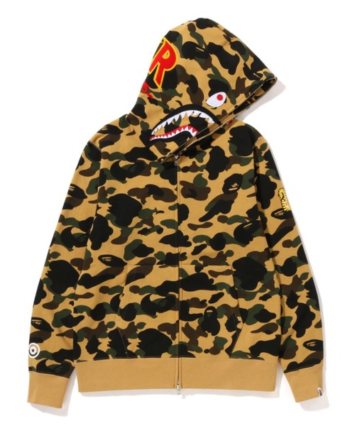 風合いの良いコットン裏毛素材を使用した1ST CAMO柄を総柄プリントしたジップアップフーデッド。フードフロントにSHARKのフェルトアップリケ・フード背面にPONRのワッペン、左腕にTIGERワッペンを叩きつけたデザイン。腹部にマフポケット、左袖にピスネームを配置。レギュラーフィットシルエット。