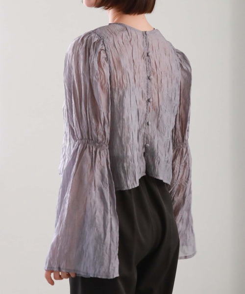 ■春を呼び込むブラウス■シアーの透け感が春らしいブラウス。表面感のあるシワ加工がこなれた印象に。前後2wayで着用出来るので着こなしの幅も広がります。肩のギャザーがフェミニンライクなデザイン。肘にシャーリングゴムが入っているので袖口に向かって広がるシルエットが一枚でもサマになります。腰上の短丈でスタイルアップ効果抜群。デニムを合わせてカジュアルに、スラックスを合わせてきれいめに、様々な着こなしを楽しめます。ハイウエストのボトムとも相性ぴったりです。ーーーーーーーーーーーーーーー透け感:あり裏地:なし伸縮性:なし光沢感:あり生地厚さ:薄め洗濯方法:手洗い可※詳しいお手入れ方法は商品についているタグをご覧くださいーーーーーーーーーーーーーーー※ご利用のモニター環境により、実際の色味と多少異なる場合がございます。… information … 欲しいitemをお気に入り登録(♡マークをclick) ・お買いのがし対策…完売itemの再入荷やラスト1点の情報をお知らせ ・欲しいitemをお得にget…price downになったらいち早くお知らせ ・スムーズ検索…ZOZOのお気に入りアイテムページで簡単checkできるから、再検索不要♪