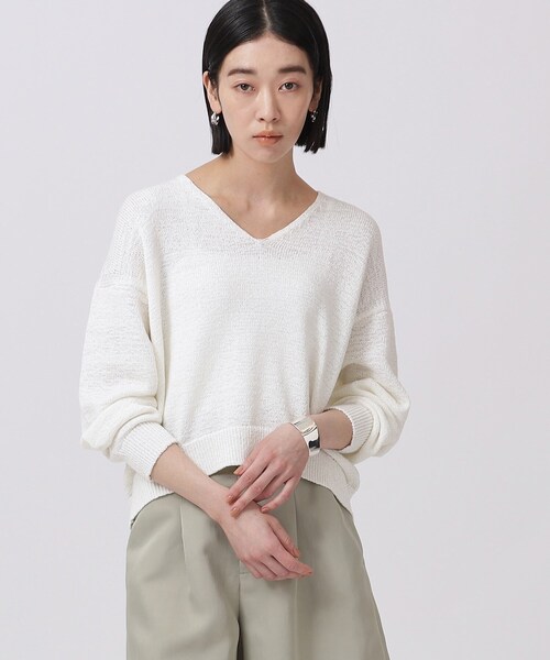 Design PointゆるっとしたシルエットのクロップドVネックニット。光沢感があり、シャリ感、ドライタッチな風合いが春夏らしいベーシックなテープヤーンニットです。Styling Point合せるボトム次第でカジュアルにもきれいめにもバランスよく決まります。着丈を短めにしているので、ハイウエストボトムとの相性も◎春先にはシャツレイヤードで裾を出して着るのがおすすめです。Fabric Pointシャリ感、ドライタッチな風合いのテープヤーン素材。店舗へのお問い合わせ商品番号:523-18411●製品寸法:38(M):着丈前52cm 着丈後56cm B116cm 袖丈45cm 肩幅55cm備考: