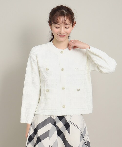 【デザイン】 人気のツイード調ニットジャケットに春の新作が登場。 ニット素材なので窮屈感無くラフに羽織れ、ON・OFF問わずに活躍。 アクセントのゴールドボタンがクラシカルな雰囲気で、春の装いを品よく大人顔にブラッシュアップしてくれます。 様々なボトムに合わせやすい、やや短めの丈感で着回し力もアップ。 お呼ばれシーンやオフィススタイルにはもちろん、デニムなどに合わせたカジュアルMIXスタイルもお勧めです。 【素材】 ざっくりと編んだツイード調のニット素材 モデル情報:身長171cm B80 W59 H88 着用サイズ:00(フリーサイズ) 店舗へのお問い合わせ商品番号:P93-48002 ●製品寸法: 00(フリーサイズ):着丈53cm B100cm 袖丈49cm 肩幅44cm 備考:重量:00(FREE)約590g