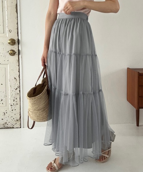 【LAUIR / ラウアー】愛らしさたっぷりのチュールティアードスカート。■detail裾に向かってボリュームのあるティアードデザインで華やかさを。ほどよいボリューム感で大人フェミニンな印象にしてくれます!また、裏地は表地より短い仕様で、足元の透け感が春秋のコーデに軽さを出してくれます。贅沢なデザインでシンプルなトップスとも合わせやすく、カジュアルにもガーリーにも着こなしできちゃう♩ウエストはバックゴムでストレスフリーな着心地◎※全色裏地付き※バックウエストゴム入り■fabricふんわりかわいいトレンドのチュール素材。………………… 透け感:あり 厚さ:薄手 伸縮性:なし 裏地:全色裏地付き シワ:なりにくい 推奨シーズン:3月~10月 ※関東の平均気温を目安に推奨シーズンを記載しております。…………………※詳しいお手入れ方法は商品タグをご参照ください。■仕様変更のお知らせ■2024年3月13日予約分より、一部仕様の変更がございます。予めご了承をお願いいたします。変更点旧仕様:全色裏地付き新仕様:全色裏地付き(アイボリーのみペチスカート付き)ペチスカート着丈:S45,M45,L47,XL49ウエスト:S64,M64,L68,XL72【必ずご確認の上、ご検討ください】・通販の特性上、到着時には畳みシワが必ずございますのでご了承ください。・掲載している画像はできる限り実際の商品に近づけておりますが、モニター環境や照明等により、実際の色味と異なる場合がございます。・商品画像は撮影時の光や角度により、実物の色味と異なって見える場合がございます。・撮影はサンプル品を使用しており、表示のサイズ感も実物とは若干異なる場合がございますので、予めご了承ください。・生産時期により色・素材・サイズ感など多少異なる場合がございます。予めご了承ください。・濃色製品は、摩擦(特に湿った状態での摩擦)や、汗・雨などで濡れた際に他の衣料やバッグなどに色移りする場合がございます。淡色・白物との組み合わせや重ね着の際はご注意ください。・洗濯の際は、他の衣類と分けて単独で洗ってください。淡色・白物と一緒に洗うと色移りする恐れがあります。・洗濯の際はネット使用をおすすめいたします。漂白剤のご使用はお避けください。・タンブラー乾燥(乾燥機の使用)は、生地の縮みや型崩れ、風合いの変化の原因となるためお避けください。・素材の特性上、洗濯や着用により多少の縮み・ゆがみが生じる場合がございます。・天然素材(綿・麻・ウールなど)を使用している商品は、繊維の特性上ネップ(糸の節)や多少の織りムラが見られる場合がございますが、素材の風合いとしてお楽しみください。・ダメージ加工やウォッシュ加工が施されている商品は、1点ごとに風合いや色の出方が異なります。製品の特性としてご理解ください。・商品生地の特性により±1~2cm(ニット製品は±1〜3cm)程度の誤差が生じる場合がございます。・着用感には個人差がございます。サイズ表記は目安としてご参考ください。・プリント・刺繍・装飾のある商品は、摩擦や洗濯により多少のはがれ・毛羽立ちが生じる場合がございます。お取り扱いにはご注意ください。・直射日光や蛍光灯の光に長時間当たると、変色・退色する場合がございます。保管の際は光の当たらない場所で保管してください。・返品・交換規定は当サイトのヘルプをご参照ください。★お買いものをよりお楽しみいただく為に!★▼商品のお気に入り登録お気に入りアイテムの完売カラーの再入荷通知や、ラスト1点の通知、セールの通知も受け取ることができます。▼ブランドのお気に入り登録新商品や再入荷など、クーポン配布などのお得な情報を受け取ることができます。