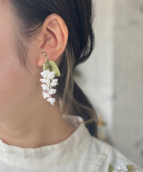 ・*:・ヤマゴボウとリーフのシリーズ ・:*・ 白いお花を何枚も重ねた、小さくころんとしたヤマゴボウのお花。 縦にすらりと伸びるように咲く様子をm.soeurオリジナルの布花で表現したシリーズ。 イヤリングは、長さの違うアシンメトリーに。ゆらゆらと揺れ、白いお花が華やかに。縦に連なったお花は、凛とした印象で耳元を彩ります。ホワイトとグリーンのお色味はシンプルなお洋服のワンポイントにも◎ 同じシリーズのブローチやブレスレットと合わせてお楽しみくださいね。 ○ ヤマゴボウ ○小さなブルーベリーのような実がつらなっているのを街で見かけたことがある方もいらっしゃるのではないでしょうか。 街でよく見られるのは、ヨウシュヤマゴボウ。初夏には小さな白いお花が連なって咲きます。"お花"といっても、お花のように見えるのはガクだそうです。そんなことを思いながら、初夏のヤマゴボウを探してみてくださいね。ヤマゴボウとリーフのシリーズピアス:80603630イヤリング:80603634ブローチ:80603635ブレスレット:80603638【m.soeur(エムスール)*】 m.soeur(エムスール)は京都発のハンドメイドアクセサリーブランドです。 植物の美しさや生命力を表現しつつもお洋服に寄り添うような、ナチュラルでクラシカルなアイテムを 制作しています。 一点一点人の手で作り上げられる手作りのアイテムは温かみがあり、使い込むごとに味わいをましていきます。 ・*:・ ・:*・ ・*:・:*:・:*・ 【注意事項】 ※こちらは一部手染めを施している商品となります。シミのように見える部分がある場合がございますが、染めの色となり、アンティークな風合いを出すためのものですので、一点一点発色が少々異なった仕上がりとなっております。 ※手作業のため、画像の商品と色、形、大きさが多少異なる場合がございますので、予め御了承下さい。※色落ちする場合がございますので水や雨等には十分ご注意下さい。※大変デリケートなお作りとなっておりますので、お取り扱いには十分ご注意下さい。